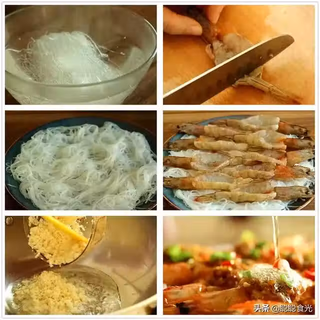 3、把處理好的開背蝦放在粉絲上面,蝦背朝上,擺好放一旁備用。