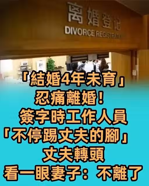 「結婚4年未育」忍痛離婚!簽字時工作人員「不停踢丈夫的腳」 丈夫轉頭看一眼妻子:不離了