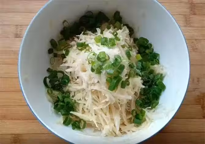 1.今天和大家分享一個酥脆土豆餅的做法,首先我們把土豆去皮擦細絲,加入一把蔥花,適量的鹽,少許的味精,攪拌至土豆變軟出水,大約攪拌兩分鐘左右。