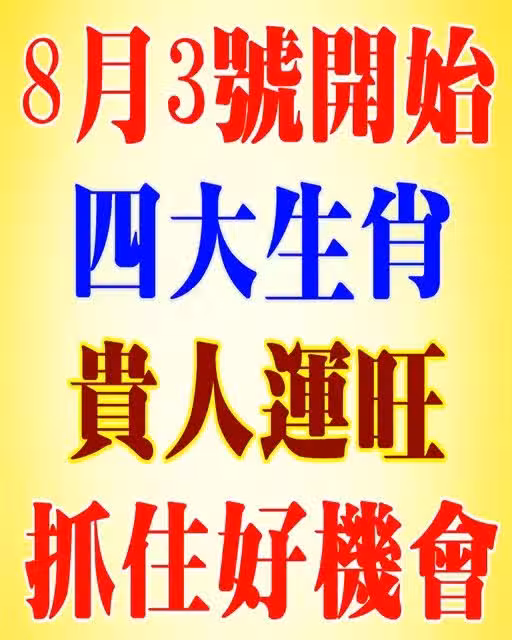 八月是一個充滿希望和機遇的月份。 隨著星象的變化,某些生肖的運勢將會大幅提升。 從8月3日起這四個生肖不僅會迎來好運,還會有貴人相助,如魚得水,事業和生活都將大吉大利。 讓我們來看看是哪四個生肖將在這個八月里幸運滿滿,並為他們提供一些簡單的建議,幫助他們更好地把握機會,迎接美好的未來。