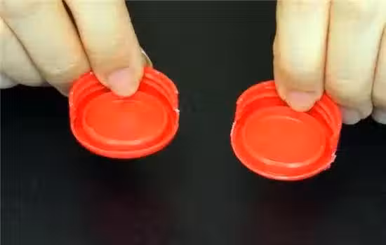 準備兩個寶特瓶蓋,用美工刀將寶特瓶蓋周圍的 半圈割掉,割的時候小心一點,不要割到手。