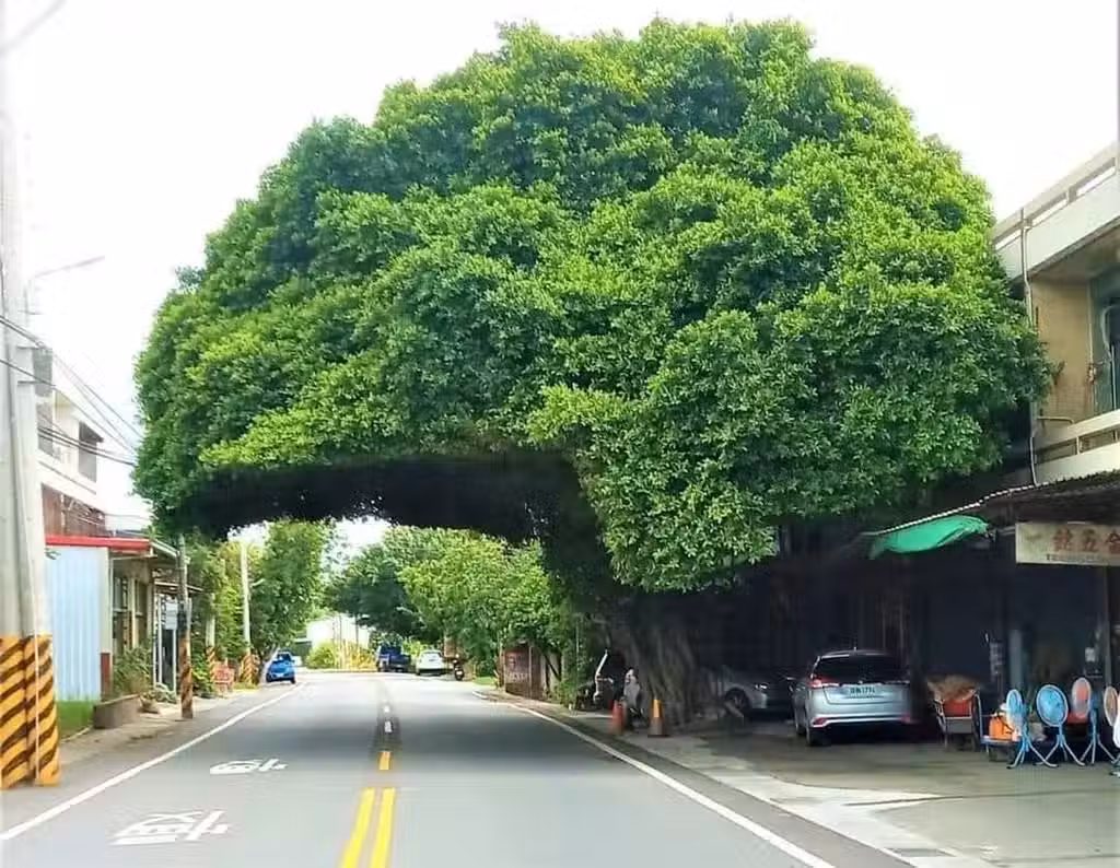 原PO在臉書社團《爆廢公社》中轉載圖片,只見彰化埔鹽員鹿路的街道旁有棵綠油油、枝葉相當茂密大榕樹,只不過在街道正上方的樹葉區塊卻出現一個平整的直角缺口,從遠處看過去就像一大頂「安全帽」架在路邊,奇特造型早已成為當地著名的景點,許多路過的觀光客也會到此朝聖,記錄下一張張天然巨型安全帽的照片!