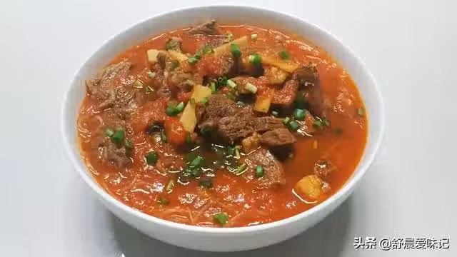 12.把燉好的牛肉趁熱倒在粉絲上,加一下小蔥點綴一下,美味即享