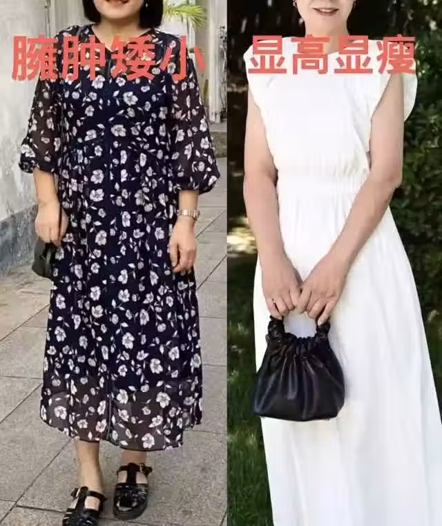 上圖為例,通過對比不難發現,兩位女性年齡、體型差距並不是特別大,但右邊女士在視覺上看起來比例卻更好,收腰的設計讓整個人更加勻稱;而左邊沒有腰身的裙子模糊身材曲線的同時,看起來顯矮顯胖。