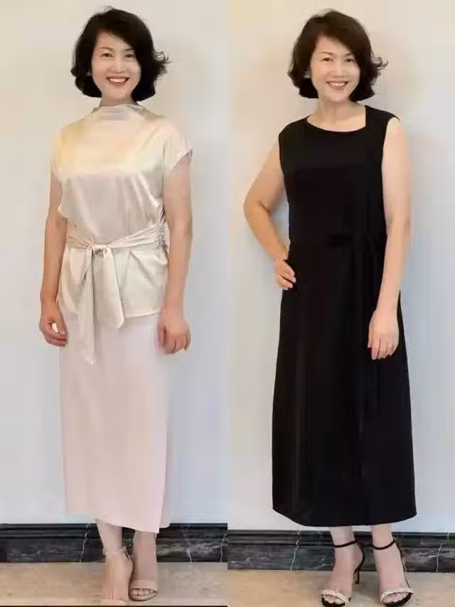上圖這位女性,左邊穿搭是桑蠶絲流光金色襯衫搭配米色側開叉連衣裙,設計感滿滿;右邊穿搭是天絲黑色連衣裙,簡潔幹練的同時,又很顯氣質。