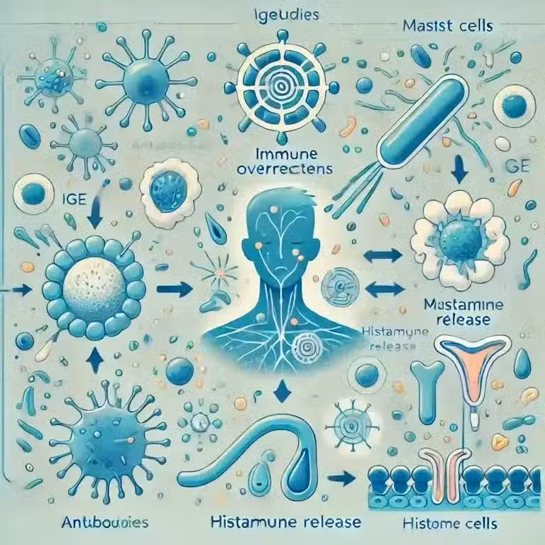 當同一過敏原再次進入體內時,這些IgE抗體會迅速識別並結合過敏原,觸發肥大細胞和嗜鹼性粒細胞釋放組胺和其他炎症介質。這些物質導致了我們熟悉的過敏症狀,如打噴嚏、流鼻涕、皮膚發紅或瘙癢等。