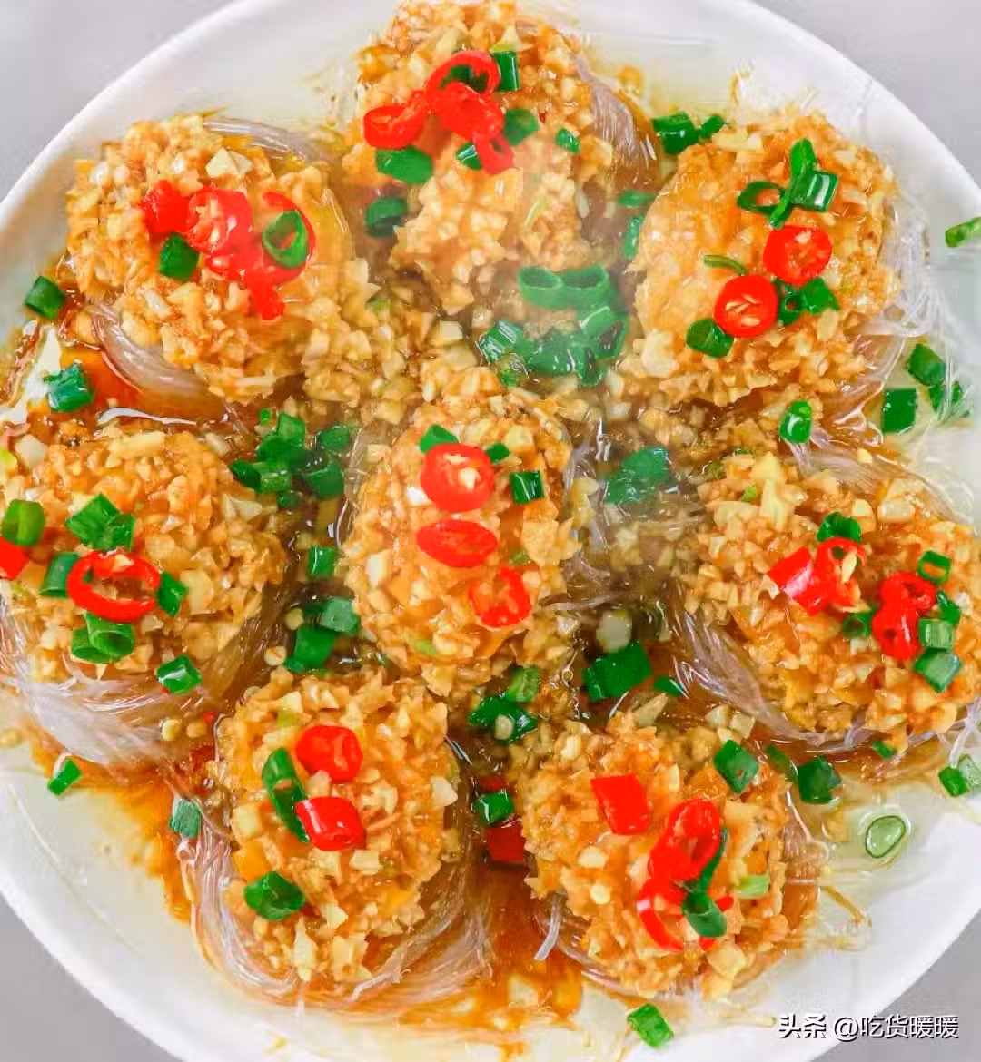 (招財進寶)鮑魚洗凈改花刀擺在粉絲上蒜切成末潑熱油 加2勺生抽