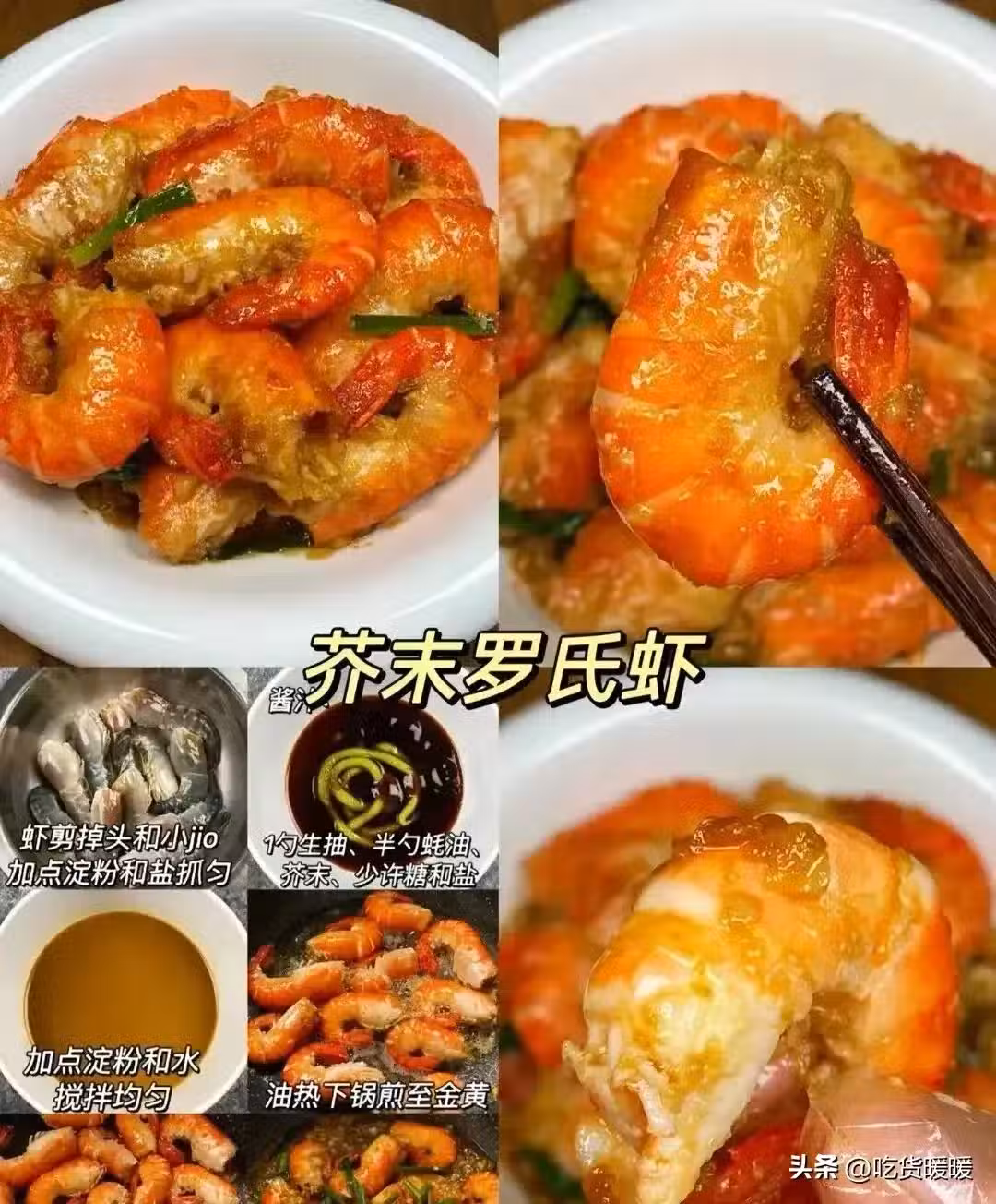 蝦剪掉頭1勺生抽、半勺蚝油、加點澱粉和鹽抓勻 芥末、少許糖和鹽加點澱粉和水攪拌均勻 油熱下鍋煎至金黃炒香蒜末 加入醬汁、 蔥段翻炒出香味 燜煮2分鐘收汁出鍋。