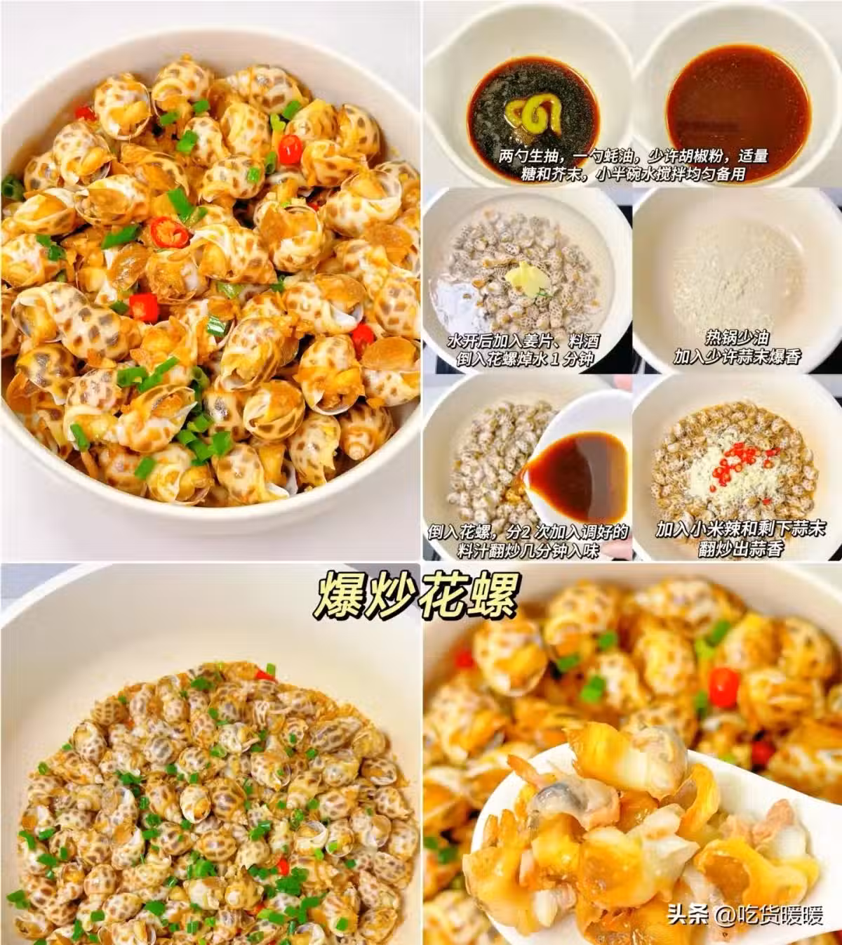 兩勺生抽,一勺蚝油,少許胡椒粉,適量糖和芥末,小半碗水攪拌均勻備用水開後加入薑片、料酒 熱倒入花螺焯水1分鐘 加入少許蒜末爆香倒入花螺,分2次加入調好的 加入小米辣和剩下蒜末料汁翻炒幾分鐘入味 翻炒出蒜香爆炒花螺撒上蔥花出鍋。