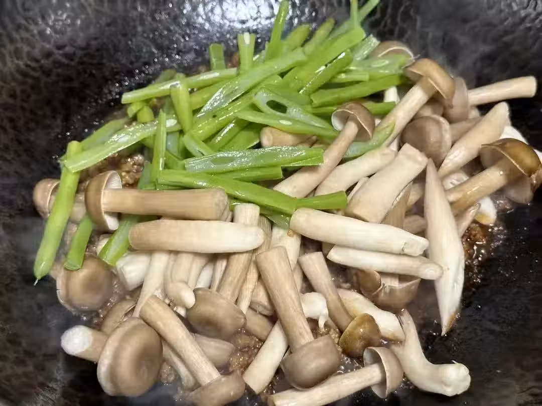 4、翻炒均勻,補點鹽和生抽翻炒至食材斷生;最後淋入水澱粉勾芡,大火收汁即可。
