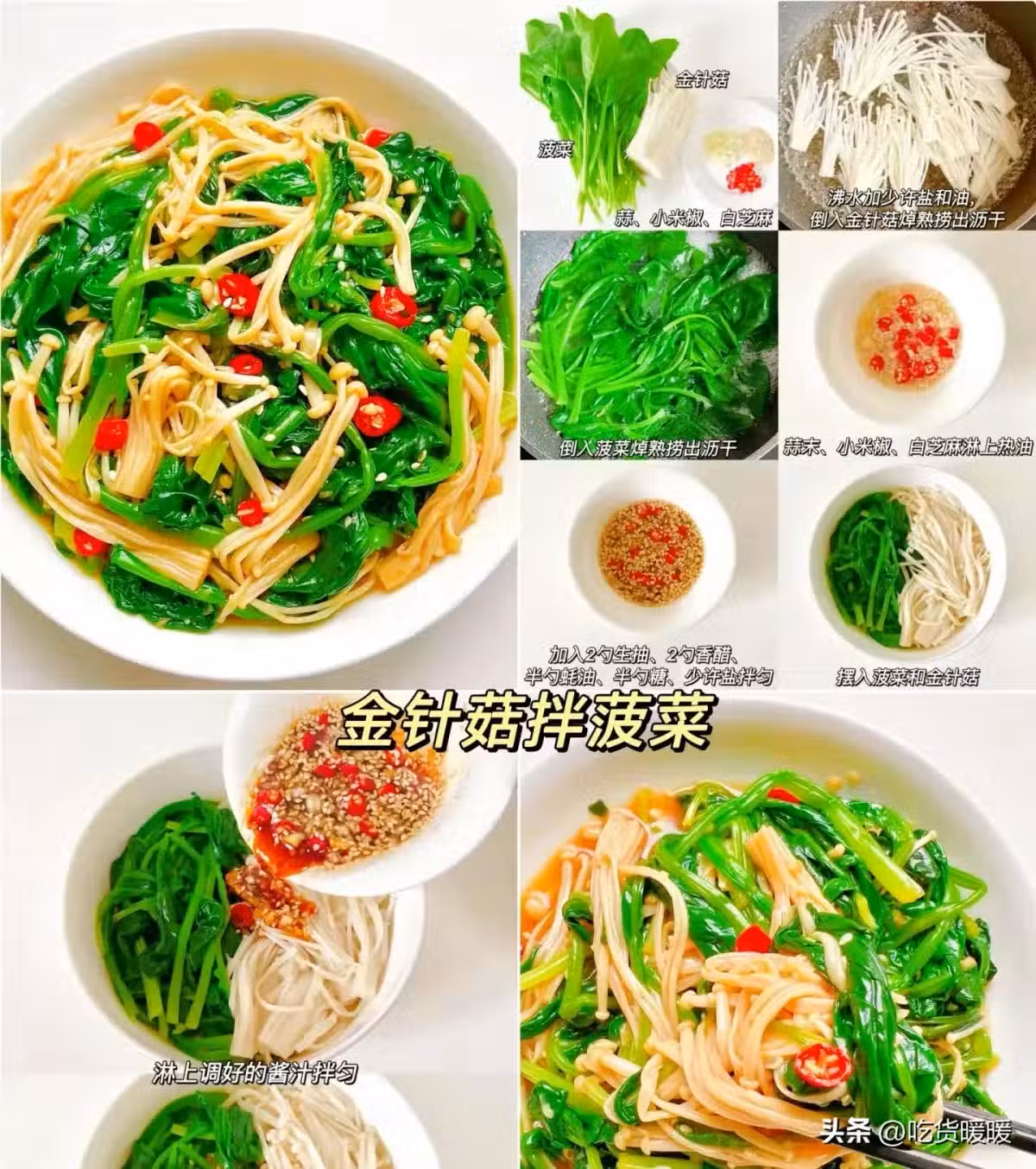 菠菜沸水加少許鹽和油,小米椒、白芝麻 倒入金針菇焯熟撈出瀝干 倒入菠菜焯熟撈出瀝干 蒜末、小米椒、白芝麻淋上熱油 加入2勺生抽、2勺香醋、金針菇拌菠菜 半勺蚝油、半勺糖、少許鹽拌匈 擺入菠菜和金針站 淋上調