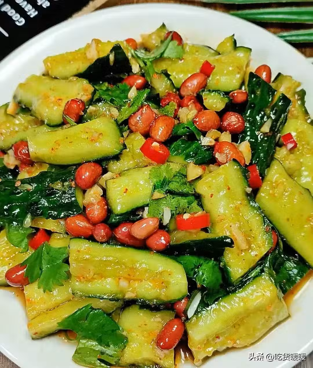 2.調料汁:兩勺蔥花、一勺辣椒粉、一勺熟白芝麻、兩勺蒜末,淋上熱油,攪拌。再加三勺生抽、兩勺陳醋、半勺鹽、一勺白糖、一勺芝麻香油,攪拌均勻。3.在一個大碗中,放入切好的黃瓜、熟花生米和香菜。