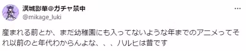 「對於4X歲的大叔而言,所謂以前的動畫差不多是《庫洛魔法使》、《新機動戰記鋼彈W》、《新世紀福音戰士》、《機動戰艦》、《秀逗魔導士》、《幽游白書》之類的吧……跟年輕人聊這個太難受了w」