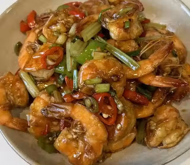 食材:基圍蝦,芹菜,小米椒,青線椒,姜蒜,香蔥。