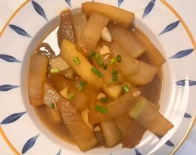 5、接下來,倒小半碗清水進去。等水開了之後,轉小火,慢慢地煮一下冬瓜。煮到冬瓜變得有點透明,就說明差不多熟了。這個時候,可以轉大火,把鍋里多餘的湯汁收干。最後,把之前切好的蔥花撒在冬瓜上面。