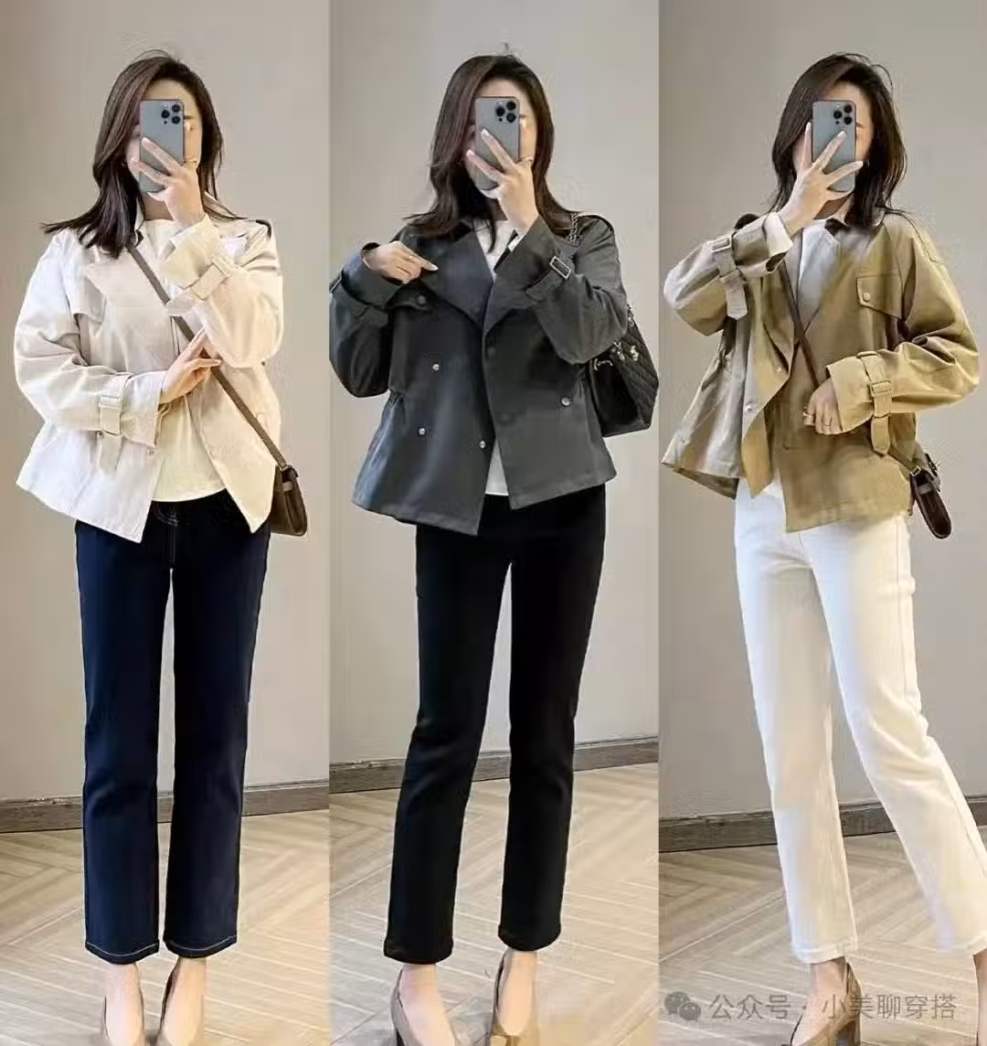 短款外套,比如小皮衣或是短款風衣搭配九分煙管褲非常不錯,簡潔利落彰顯出職場女生的颯爽感。比如深灰色的短款風衣搭配黑色煙管褲,看著很精神爽利,特別適合上班穿。
