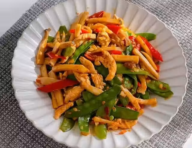 食材:雞胸肉50克,荷蘭豆100克,杏鮑菇100克,大蒜2瓣,小米辣2根,紅泡椒1根