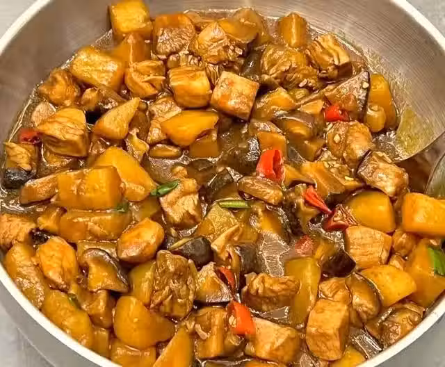 3、油熱炒雞胸肉,倒入土豆和香菇,翻炒後倒入料汁,煮開後小火燜煮15分鐘左右,中途要翻拌小心糊鍋,最後撒上小米辣和蔥花,湯汁濃稠後出鍋