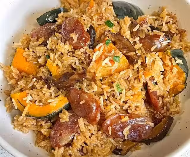 3、油熱下蔥、洋蔥,炸至金黃撈出,倒入臘腸、貝貝南瓜、香菇翻炒,淋入調好的料汁,倒入米飯炒勻