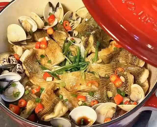 4、香料炒香後,把準備好的蔬菜倒進去,加點鹽調味。然後鋪上腌制好的魚塊和白貝,淋上兩圈料酒,讓魚肉和蔬菜充分融合。中火焗煮5-7分鐘,別忘了蓋上鍋蓋,讓魚肉充分吸收香料的味道。