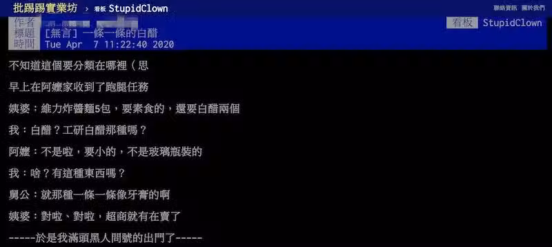 對此,網友們看完後全都笑翻了,紛紛詢問原PO是否嘉義人,因為在嘉義、台南都有許多長輩會稱呼它為「白醋」,而原PO則回答,自己來自高雄,不過卻有很多親戚來自嘉義,不排除阿嬤被同化了。
