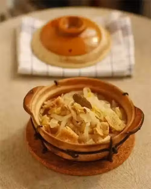 2、把脆豆腐和酸菜放到砂鍋里加水慢煲,記得要加幾粒花椒,一顆八角和兩片香葉