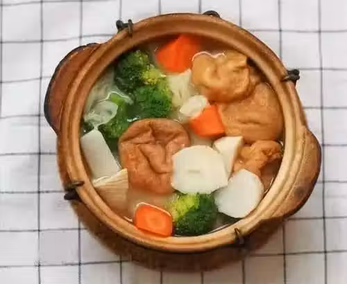 材料:油麵筋 筍 白菜葉 山藥 胡蘿蔔 西蘭花 鹽