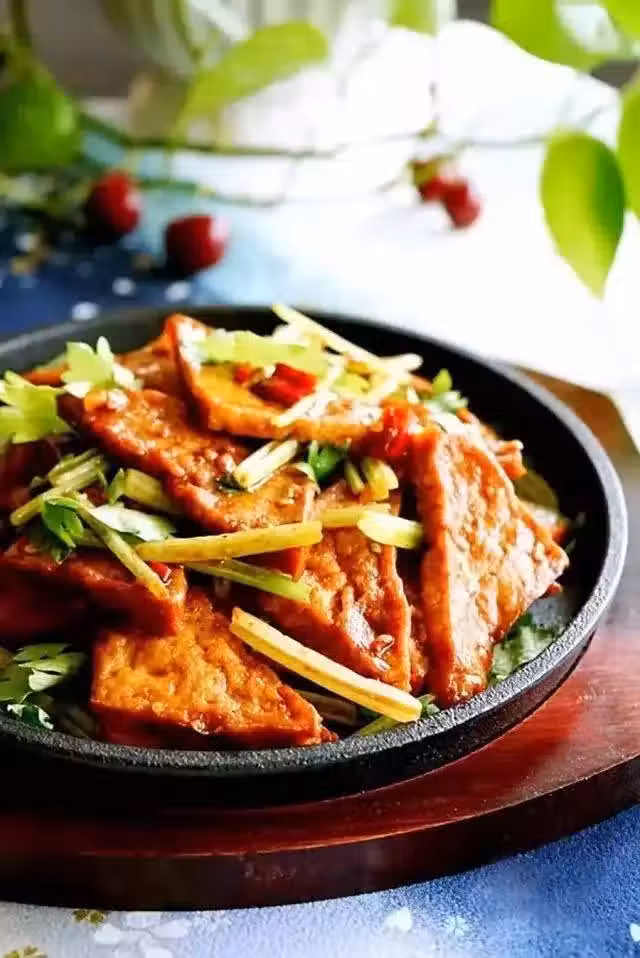 8.把做好的豆腐倒在鐵板上。鐵板能很好的保溫,加熱後的芹菜葉子散發出濃郁的芹菜芳香味道。使得這道鐵板豆腐吃起來更清爽。