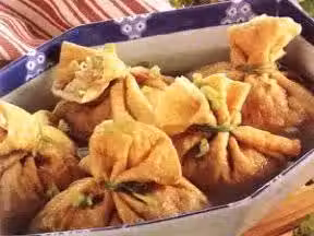 3.福袋(豆皮兒)一切為二,每片在切口處撕開,將炒好的丁料盛入八分滿,再用燙軟的芹菜捆緊封口做成袋。