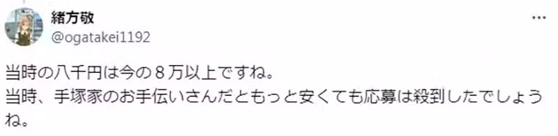 「我看過我爸的薪資單,我爸在那個年代的建設公司薪水大概是12,000日圓。如果有時光機,知道手塚治虫將來對漫畫界的貢獻的話……8,000日圓很夠了!!」