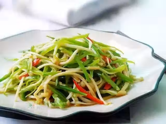 把調味汁加入金針菇、荷蘭豆和椒絲中拌均勻就可以了