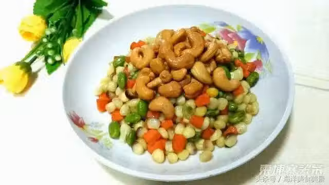 3、起鍋熱少許油,爆香薑末,先倒入胡蘿蔔丁炒至七、八成熟後,再放入玉米粒、腰果、黃瓜丁翻炒,最後用鹽、蘑菇精調味即可。