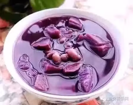 2、鍋內加水,放入紅豆,大火煮;待紅豆煮至開花,倒入紫薯塊;待紫薯煮熟,加入適量的白糖稍煮即可。