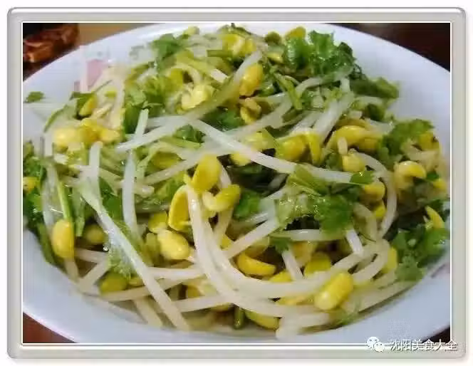 2、起鍋熱少許油爆香薑末倒入黃豆芽快速翻炒中間淋一點點水並用鹽、蘑菇精調味待水收干後即可出鍋裝盤時拌入香菜即可。