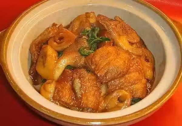 4、再入炸過的面腸豆包鮮菇及醬油、水、冰糖、味醂燴煮約5分鐘。
