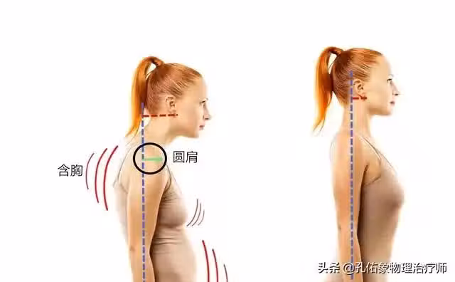 圓肩,是肩胛骨的位置發生了外展和手的上臂肱骨發生了內旋所致。當您在照鏡子時,會感覺自己的肩膀往前往內扣,特別是女性比較多見;對於這樣的圓肩體態可以單獨發生,也可以和上圖中的含胸體態同時發生,每一個人的體態都會有不一樣。