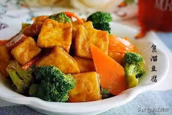 8.爆香薑片,倒入豆腐和炒好的時蔬翻炒,最後倒入調味汁,再放些水澱粉,帶豆腐上包裹調味汁就關火。