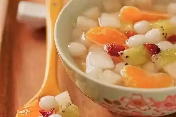 材料:糯米小圓子 、梨 、冰糖桔 、獼猴桃 、冰糖 、枸杞