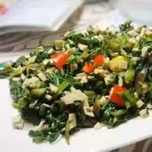 2、白豆腐乾切末,和茼蒿一起裝入大碗中,用鹽、香醋、糖、蘑菇精、麻油調味拌勻即可。喜歡辣味的還可加點辣子油。