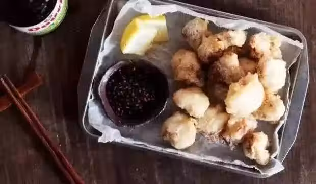 4、猴頭菇裹上面糊後下油鍋,中小火炸熟,撈起瀝油後擺盤,配上醬汁食用。,