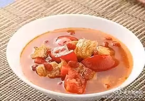 食材:蕃茄2顆、豆包30克、水1000毫升、枸杞10克、蕃茄醬4大匙、鹽1小匙