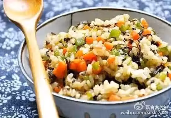 食材:橄欖油1湯匙、薑末1茶匙、胡蘿蔔半根(切塊)、青椒半個(切塊)、梅菜乾1/2杯(泡軟洗凈)、糙米1杯(煮熟)、醬油1湯匙)