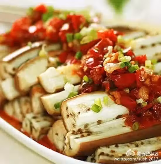 3、待茄條蒸好後取出,將炒好的剁椒倒在茄條上即可。