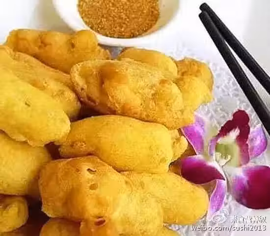 4、把腌好的天貝粘上調好的糊,過油(油六七成熱),炸兩三分鐘撈出,裝盤,配椒鹽即可。