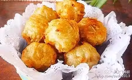 4、油溫升至八成熱放入炸過的丸子,炸至金黃色即可撈出。
