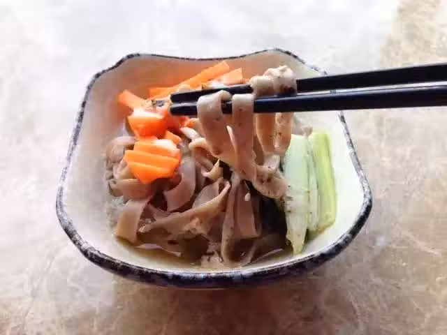4、準備一盆涼開水,鍋里燒開水,下一小勺鹽,水沸後下麵條,熟後撈出放進涼開水中,用筷子抖散開,撈出,裝盤