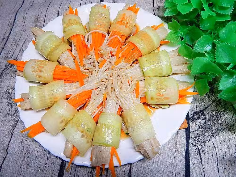 1. 黃瓜去皮,切薄片;2. 胡蘿蔔切絲、金針菇切掉頭部;3. 胡蘿蔔絲和金針菇分別焯水備用;4. 調碗汁:生抽+醋+鹽+蔬果粉調勻;5. 一根黃瓜片加入燙好的金針菇;6. 在加入胡蘿蔔條,全部捲起來;7. 然後把調好的汁潑至黃瓜卷上;8. 吃的時候攪拌均勻即可。