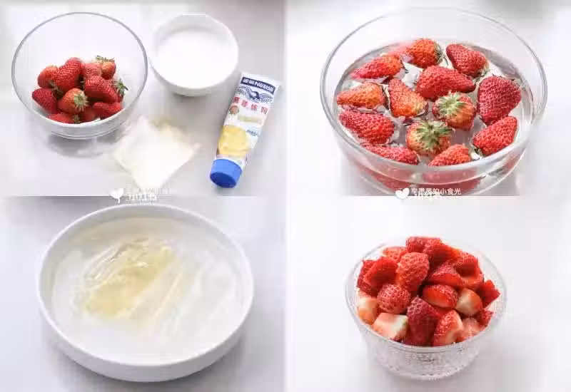 1. 將吉利丁片用冷水浸泡變軟,草莓洗凈切成小丁塊。
