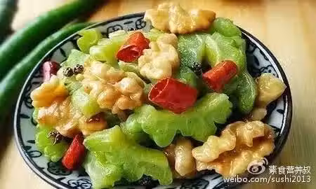 原料:苦瓜150克、核桃(鮮)40克、調和油、鹽、花椒、蘑菇精、辣椒各適量