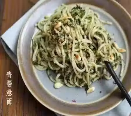 青醬(二人份,羅勒葉一把,松子仁4大匙,鹽、黑胡椒粉、橄欖油、意面適量